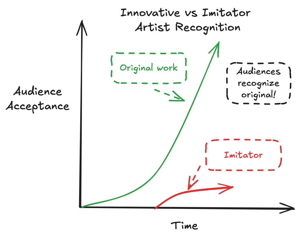 Having gained recognition, an artist's work draws imitators. Fortunately for the innovator, this does not typically detract from the innovator's recognition - people prefer the work of the innovator. Crucially, there is a time delay for imitators of human artists to emerge. This window allows the reputation of the innovative artist to solidify.