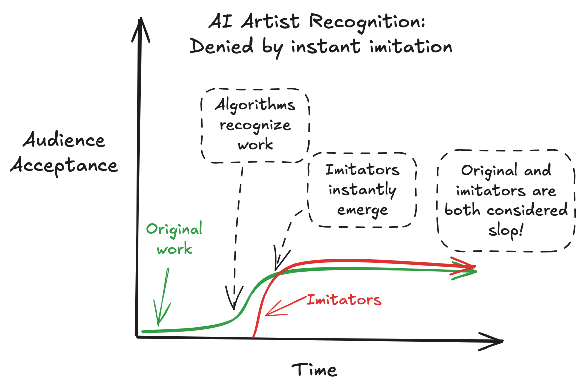 The instant imitator trap precludes creative recognition, regardless of model capabilities. It doesn't matter if models become 10x smarter or more technically adept. So long as work can be instantly generated and algorithmically distributed, recognition of originality (to the degree that any AI work can be said to be original) is impossible.