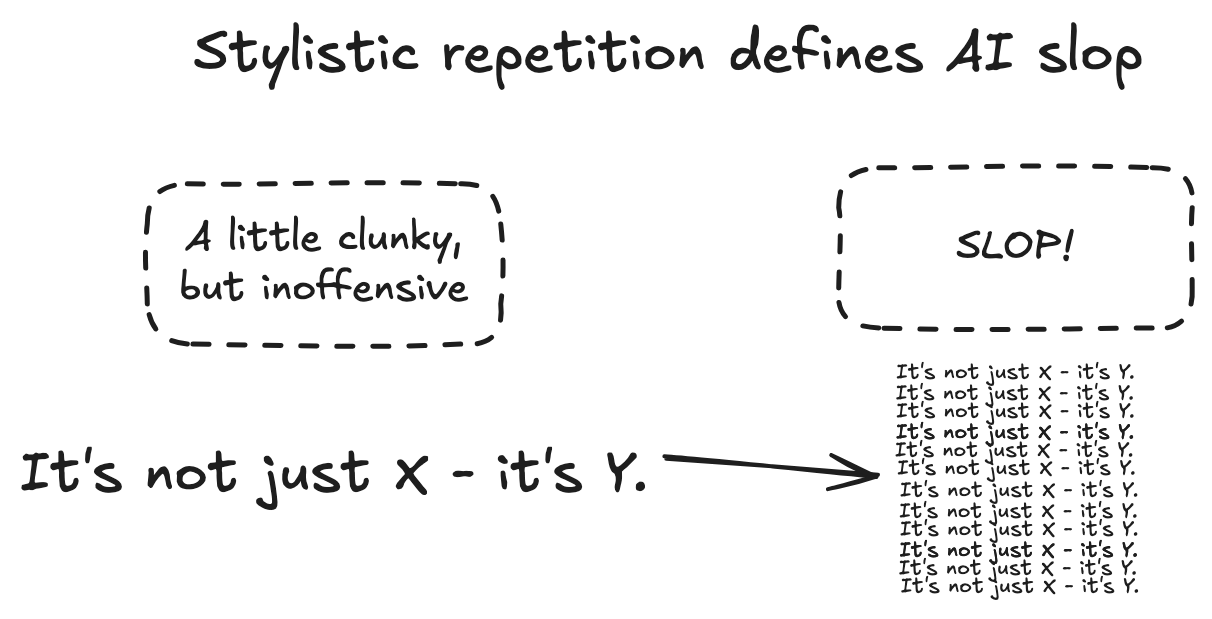 The inclusion of the word usually makes this definition flawed: the quantity of generated work is crucial. In isolation, the stylistic tendencies of AI are not all that bad. It's when consumers are exposed to them algorithmically and ad nauseam that they become slop. We see this in the fad popularity of novel AI imagery like Studio Ghibli profile pictures: A burst of popularity as people have fun with a new tool, before giving way to eye rolls.